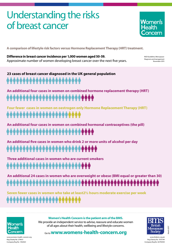 A great infographic on the risk factors of breast cancer. It highlights that estrogen only HRT decreases the risk of breast cancer and drinking alcohol or being obese increase the risk of breast cancer. For me this is why taking HRT needs to be a personal decision, and put into perspective. If you feel so awful with hormonal related symptoms and you can't exercise (which decreases your risk of breast cancer!), this puts you at increased risk of drinking, weight gain and stress!