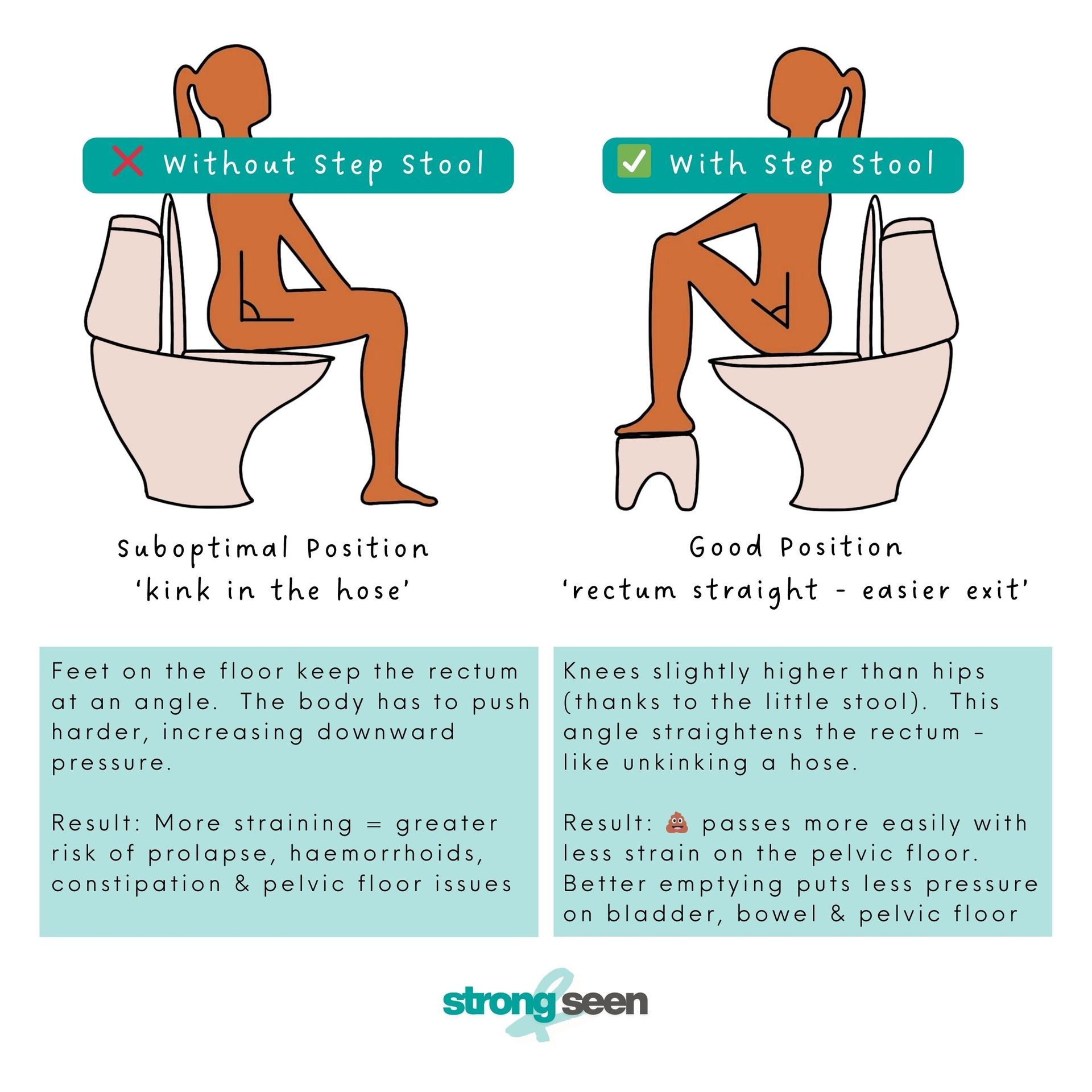 Why? Because so many women believe prolapse or leakage only happen after pregnancy or vaginal birth. But in reality, straining on the toilet is one of the biggest culprits. Constipation, poor toilet posture, and ignoring the urge can all put unnecessary pressure on the pelvic floor.
