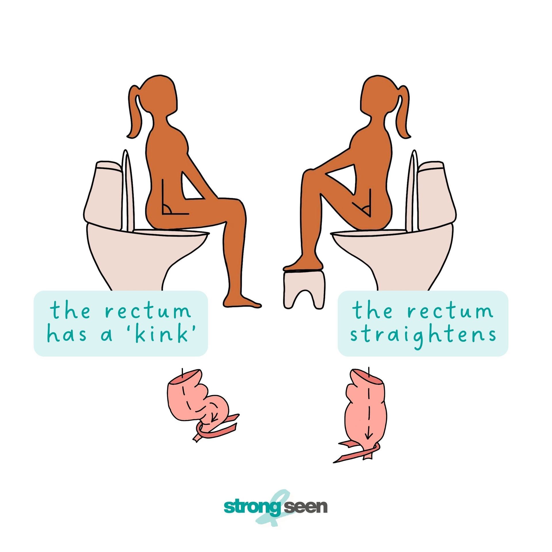 • When you sit with your knees slightly higher than your hips (using a step stool or “squatty potty”), that bend straightens out - like unkinking a hose. Suddenly everything flows more easily, with far less strain.