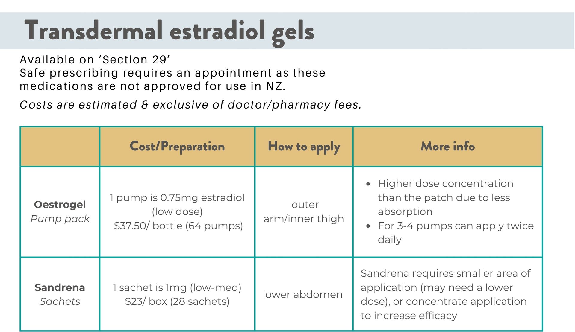 As of June 2024 the only transdermal estradiol in New Zealand is the patches containing 17B estradiol (a safe body identical estrogen). However, they are in short supply. Here is information for people of use estradiol, pharmacists, and prescribers to help make this challenge as less stressful as possible.