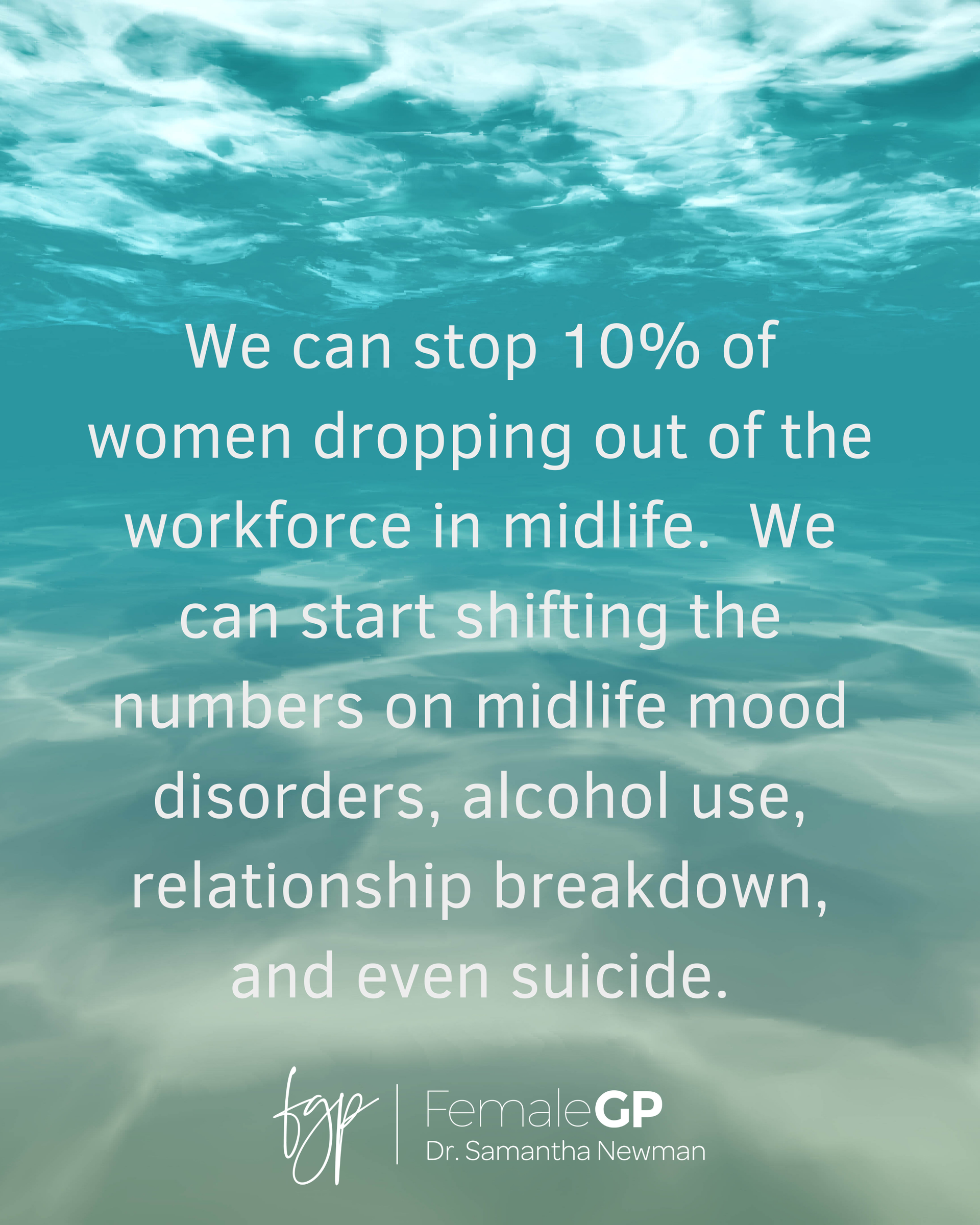 If we know what to look for—if we know how perimenopause shows up—we can support women earlier. We can stop 10% of women dropping out of the workforce in midlife. We can start shifting the numbers on midlife mood disorders, alcohol use, relationship breakdown, and even suicide.