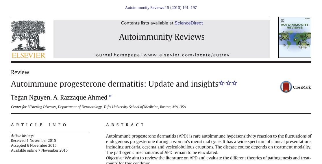 Nguyen T, Razzaque Ahmed A. Autoimmune progesterone dermatitis: Update and insights. Autoimmun Rev. 2016 Feb;15(2):191-7. doi: 10.1016/j.autrev.2015.11.003. Epub 2015 Nov 7. PMID: 26554933.